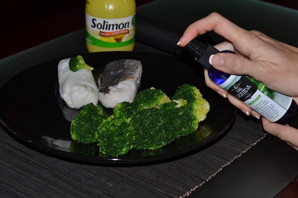 Para aderezar el brócoli de este plato, empleé la sal líquida de manantial de FOSSIL RIVER (unos de los productos estrella de la Degustabox de Noviembre, cuyo contenido podéis ver aquí). Gracias a su vaporizador, se puede controlar la cantidad a dispensar.