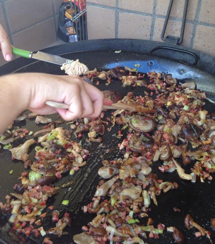 4. Transcurridos unos pocos minutos, colamos las setas y guardamos el caldo (importante, casi lo tiramos!!) y las añadimos al paelló junto con el foie (que podéis ver pegado al cuchillo, esto hay que hacerlo varias veces y dejar un poco en el bote para añadirlo al final):