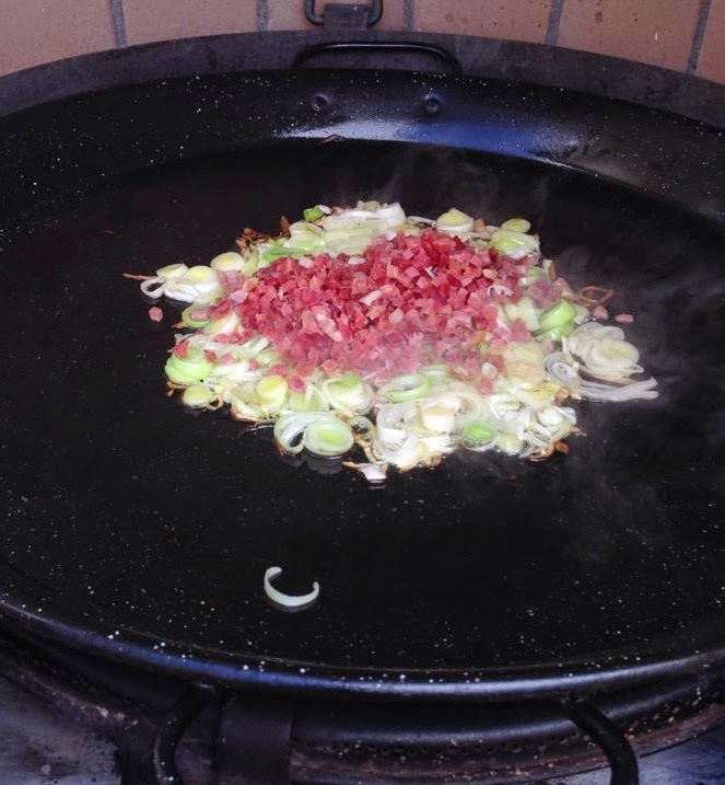 3. Una vez las setas están casi hervidas, empezamos a preparar el "paelló" (utensilio donde cocinaremos la fideuà, para forasters): añadimos aceite de oliva y sofreímos el puerro y el jamón serrano troceado: