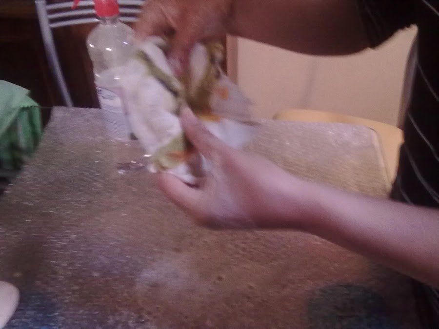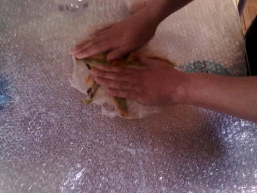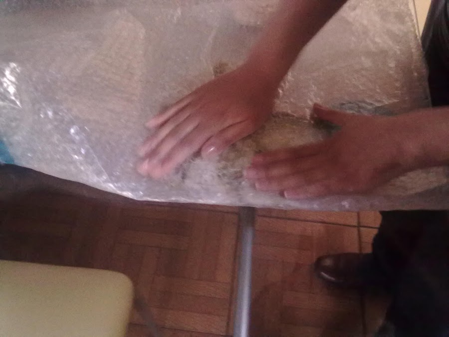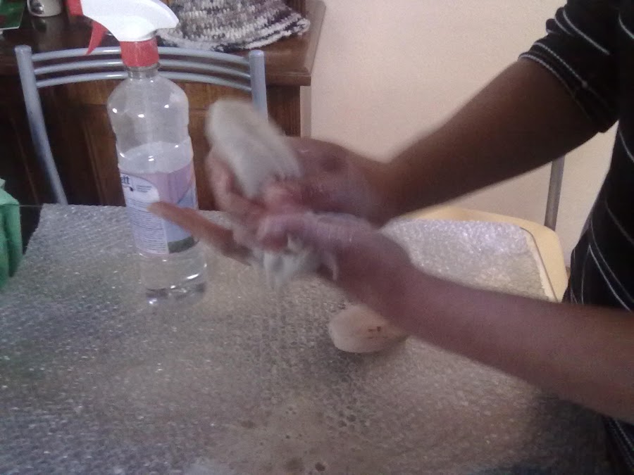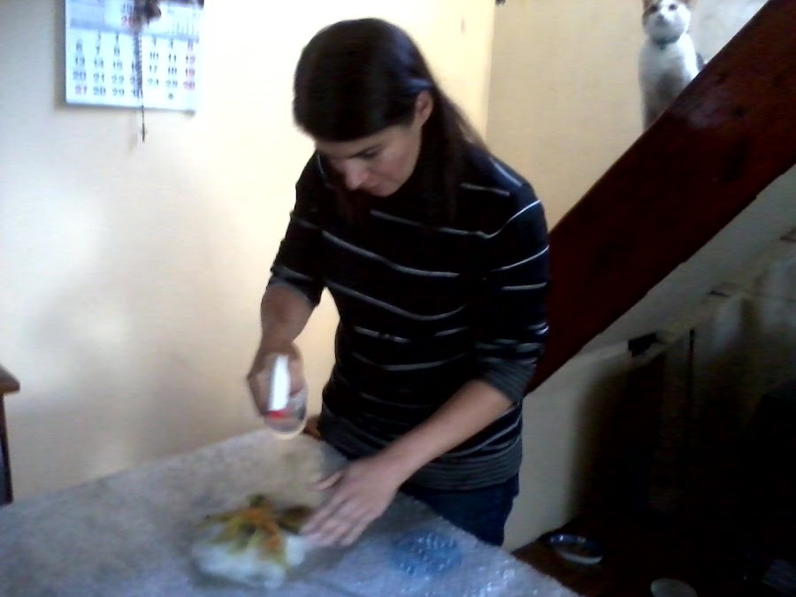 3º paso.Dar unos pequeños toques al vellón para sacar las burbujitas de aire...