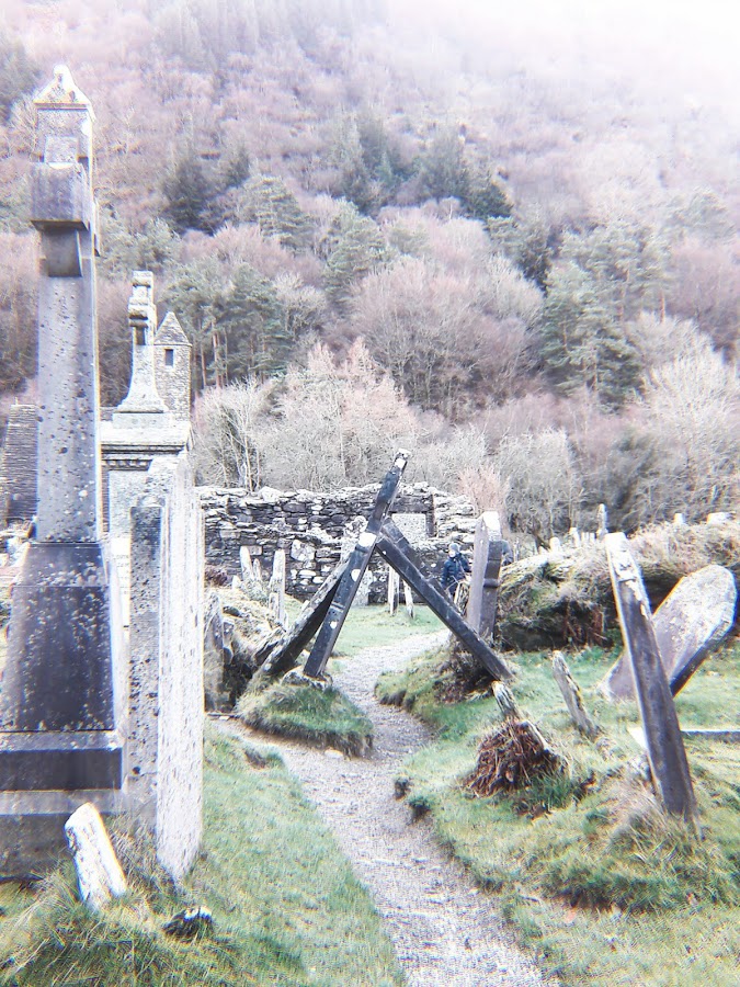 Una vez nos recogieron, nos dirigimos hacia la primera parada: La ciudad monástica de Glendalough. Como nos cuenta la guía Un corto viaje a Dublín e Irlanda (Guiarama compact), de Anaya Touring, Glendalough, que significa "valle de los lagos", se encuentra en el Wicklow Mountains National park y su formación se debió a la erosión de los glaciares durante la Edad de Hielo que originó el valle. La ciudad monástica comenzó con el monasterio de St. Kevin. A día de hoy se puede ver la Round Tower, St. Mary´s church, la catedral de St. Peter y una cruz de granito de gran tamaño, de siglo VI o VII, entre otros restos arquitectónicos.