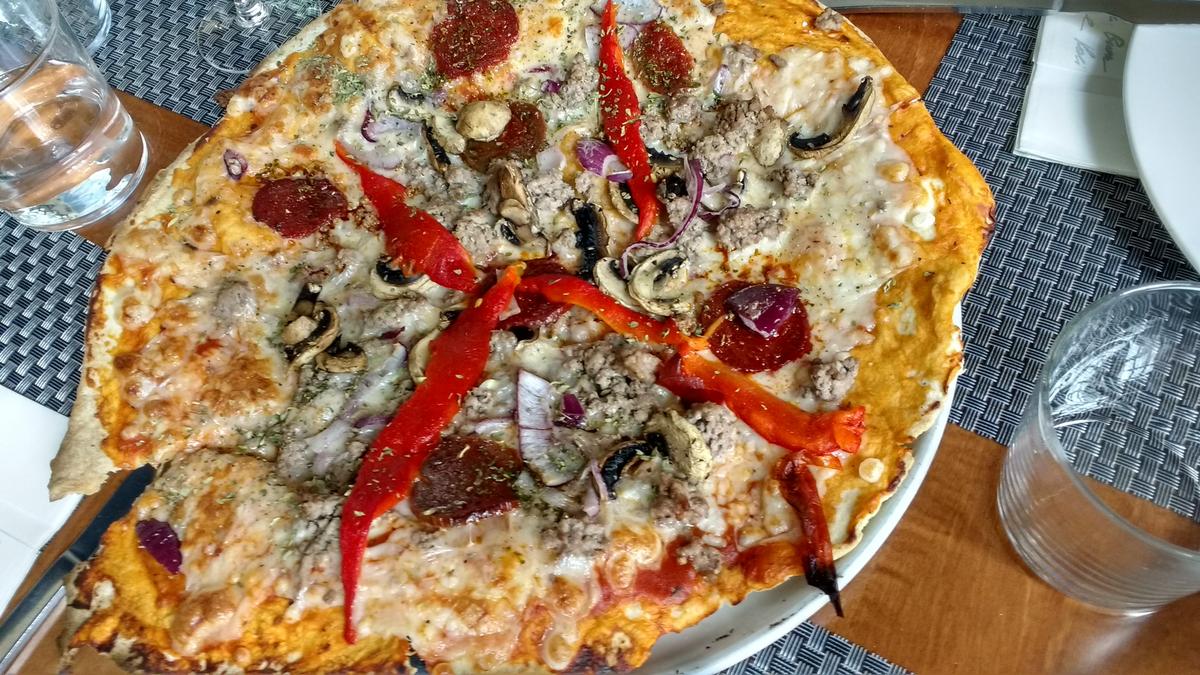 Comimos en La Cabrera en el restaurante Cachivache allí podíamos degustar de una comida italiana, en mi caso y como soy alérgica a la lactosa me sirvieron un chuletón con patatas fritas, las pizzas tenían una pinta….!!
