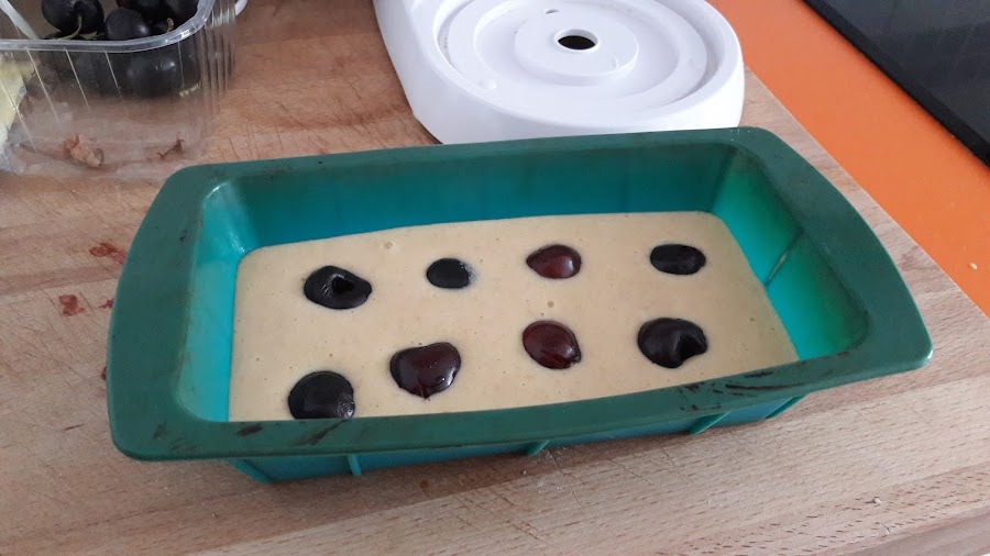 Poner la mezcla en un molde mediano y añadir las cerezas.