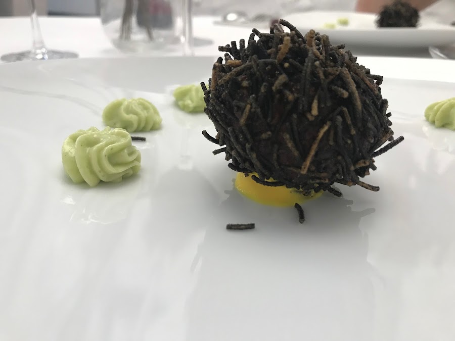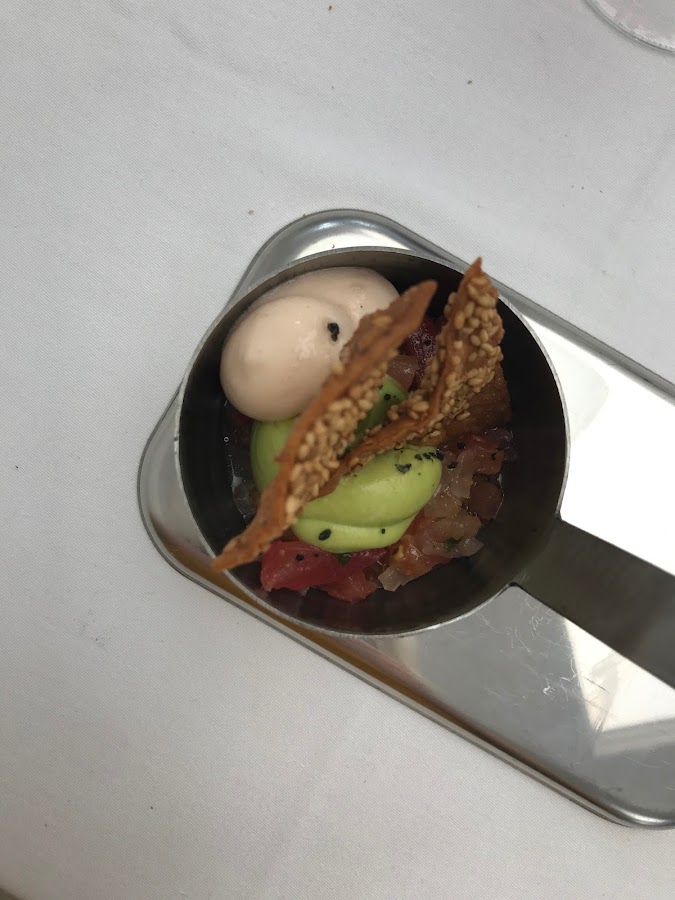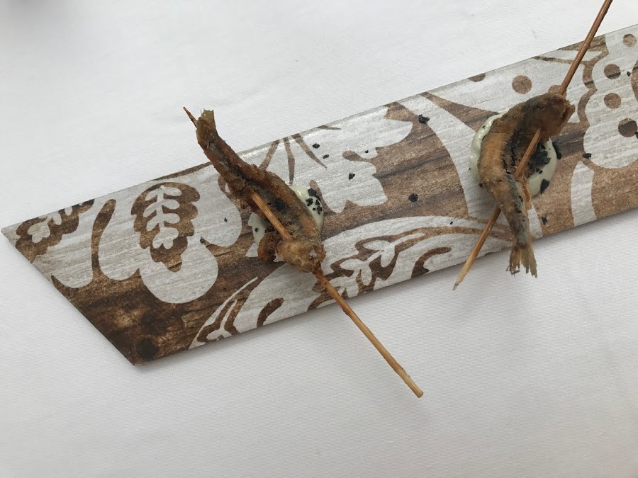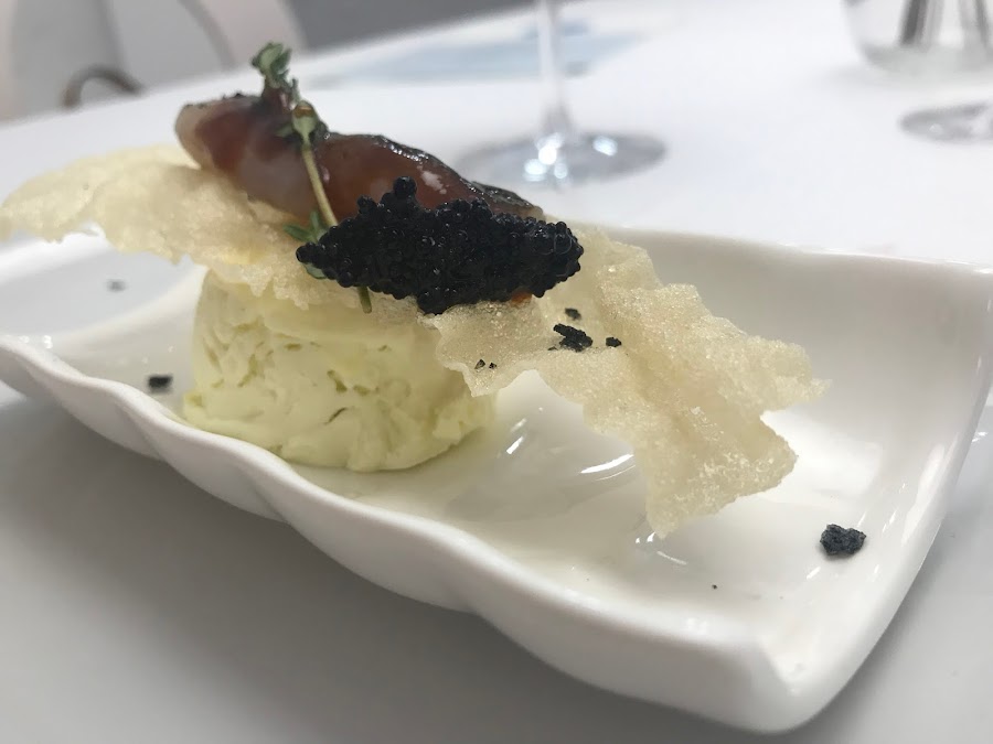 Caballa ahumada con tomillo, helado de wasabi, teriyaki y crujiente de sal (plato súper favorito, ¡me encanta la caballa!)