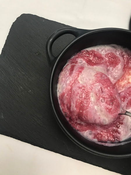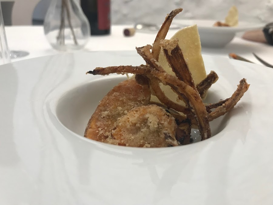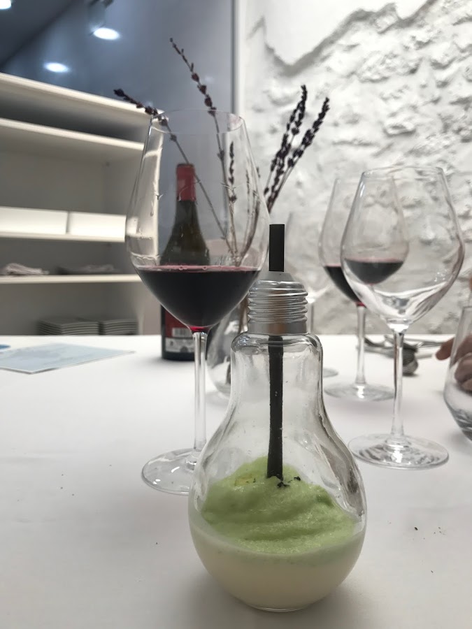 Celebramos el cumpleaños de mi chico hace unas semanas y pensé que parte del regalo podía ser esta gastroexperience, y no me equivoqué. Todavía tuvimos suerte y pudimos probar el Menú Especial 365, con el que conmemoraban su primer aniversario, eso sí, escogimos el corto y ¡menos mal! Empezamos con una cervecita (yo) y una copita de vino (él), cortesía de la casa como aperitivo. Para la comida elegimos el vino Baltasar Gracián "El Héroe" Viñas Viejas, una garnacha de Calatayud que me habían recomendado y no decepcionó. Por orden de salida, los platos fueron los siguientes: