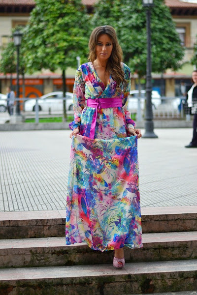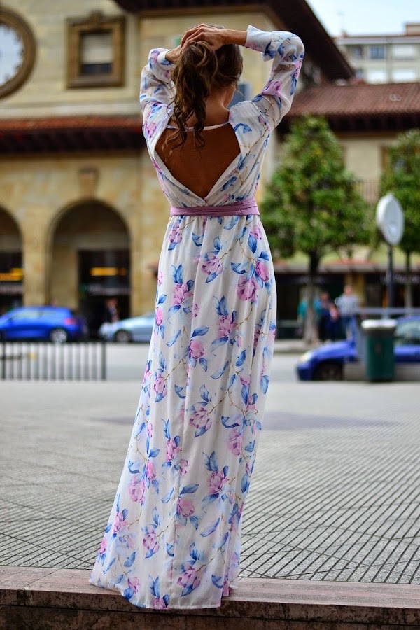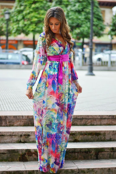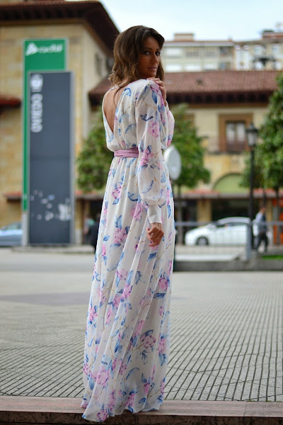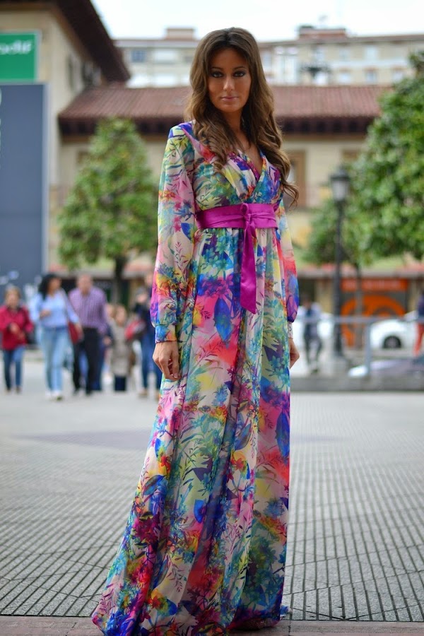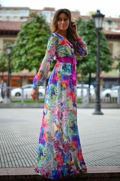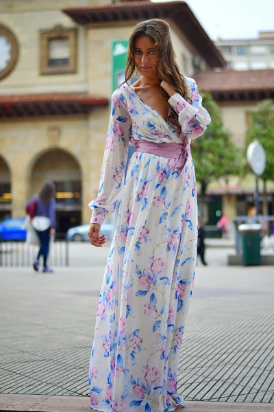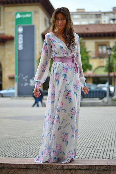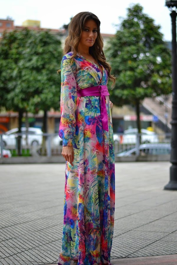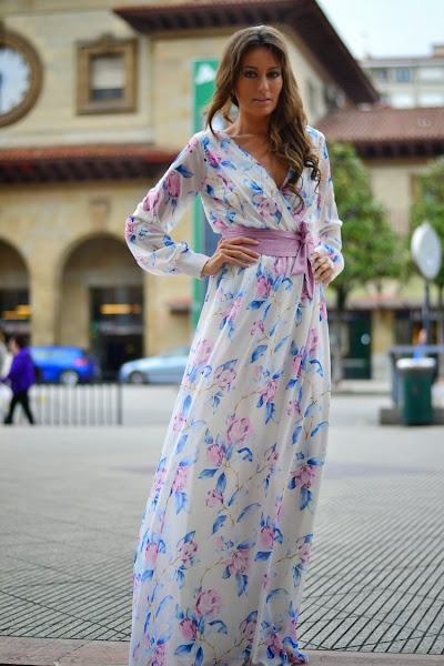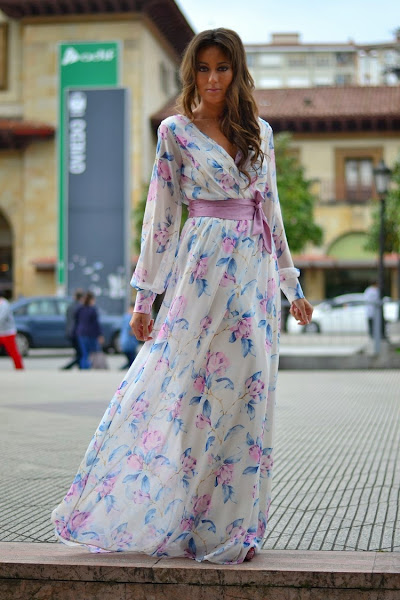 Qué duda cabe de que se llevan los 70, con sus atrevidos estampados florales en largos vestidos de espíritu bohemio y tejidos etéreos que rozan el suelo, como éste primero que hoy os acerco y que me encanta.