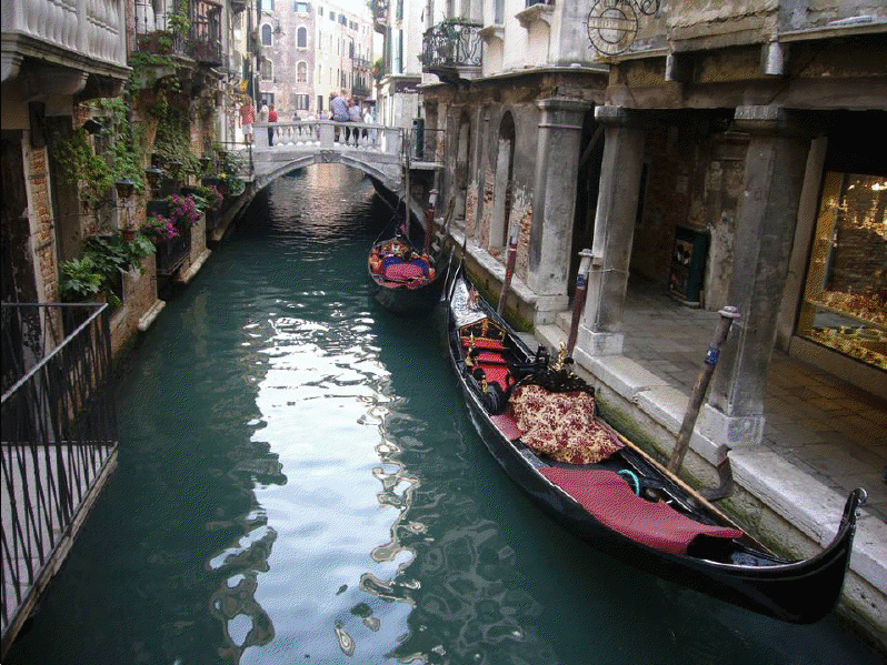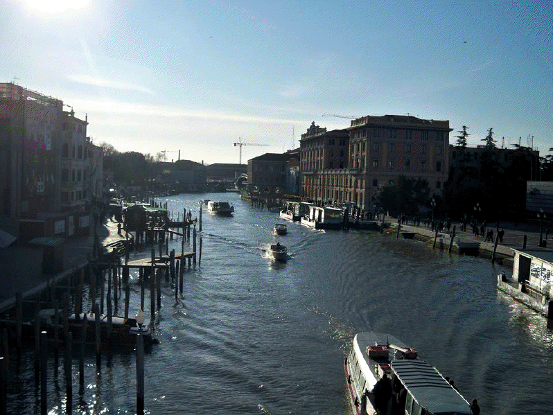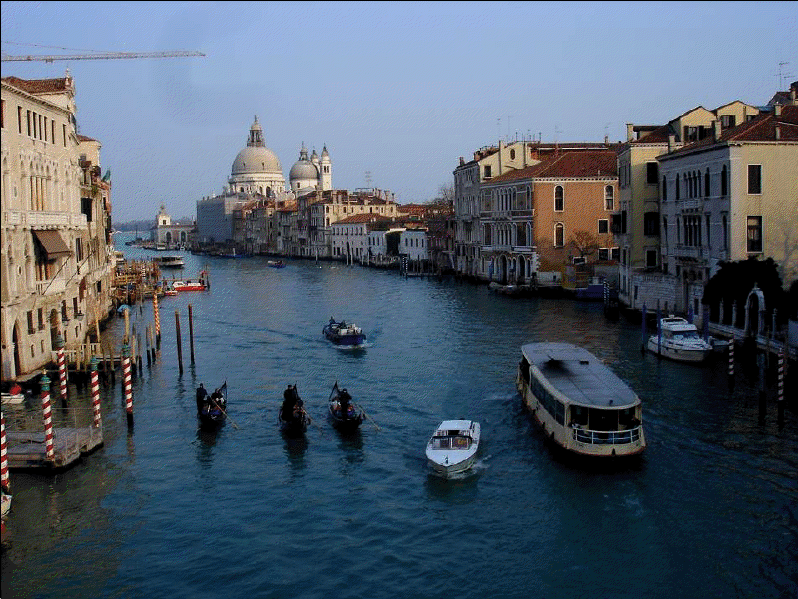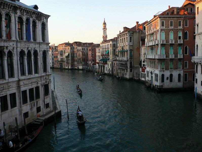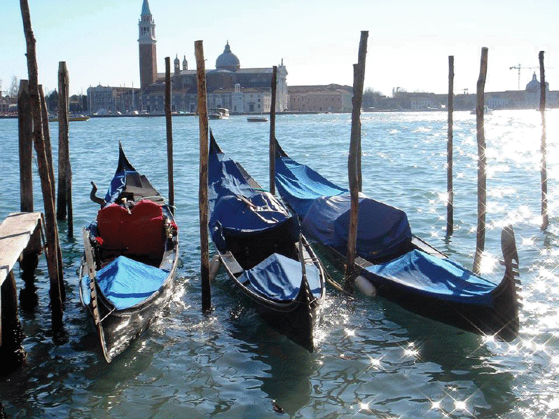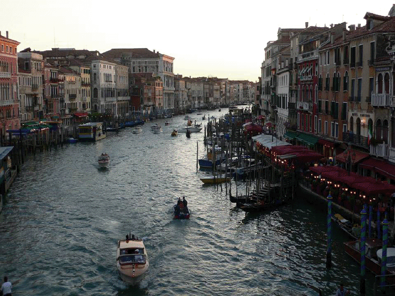 Venecia, construida en un archipiélago de 118 pequeñas islas junto al mar Adriático, es famosa en el mundo por sus, aproximadamente, 150 canales. Las islas están conectadas por unos 400 puentes. Sus canales componen un gran entramado a modo de calles que parten del Gran Canal, que es como una gran avenida por donde discurren multitud de embarcaciones, grandes y pequeñas, siendo estas últimas las conocidas góndolas. Son muy útiles los transportes colectivos o vaporetto (a modo de barco-bus). En la parte antigua del centro los únicos medios de desplazamiento son las embarcaciones privadas, los taxis (lanchas de coste prohibitivo) y los traghetti: barcas muy parecidas a una góndola pero sin decoración, que hacen de puente en diversos puntos del Gran Canal.