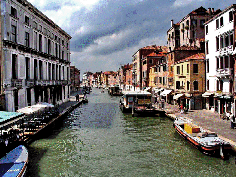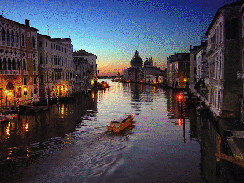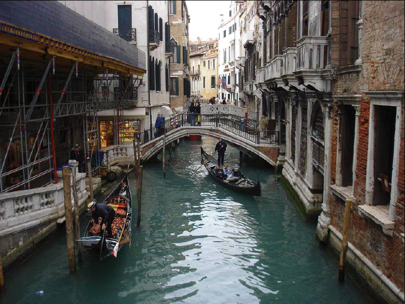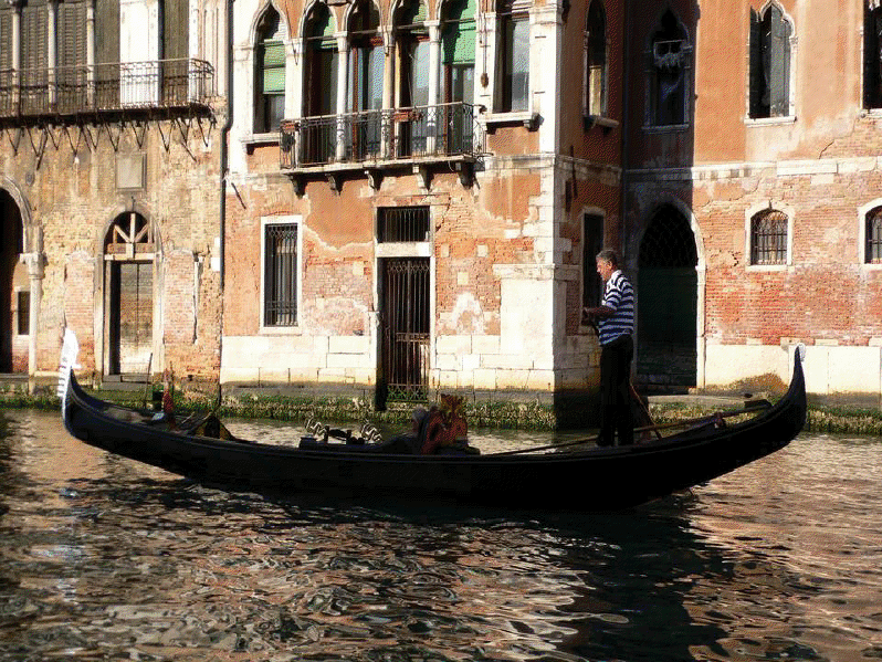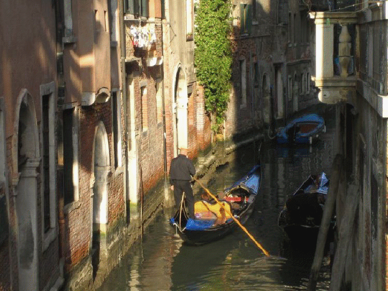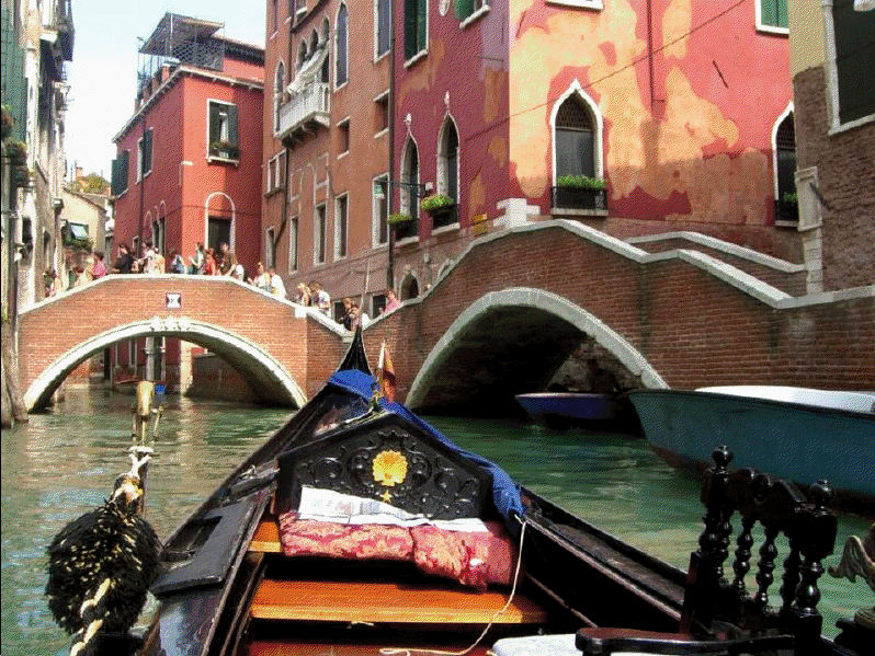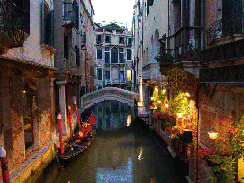 Venecia, construida en un archipiélago de 118 pequeñas islas junto al mar Adriático, es famosa en el mundo por sus, aproximadamente, 150 canales. Las islas están conectadas por unos 400 puentes. Sus canales componen un gran entramado a modo de calles que parten del Gran Canal, que es como una gran avenida por donde discurren multitud de embarcaciones, grandes y pequeñas, siendo estas últimas las conocidas góndolas. Son muy útiles los transportes colectivos o vaporetto (a modo de barco-bus). En la parte antigua del centro los únicos medios de desplazamiento son las embarcaciones privadas, los taxis (lanchas de coste prohibitivo) y los traghetti: barcas muy parecidas a una góndola pero sin decoración, que hacen de puente en diversos puntos del Gran Canal.
