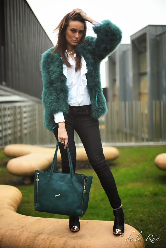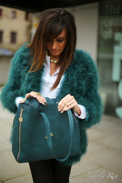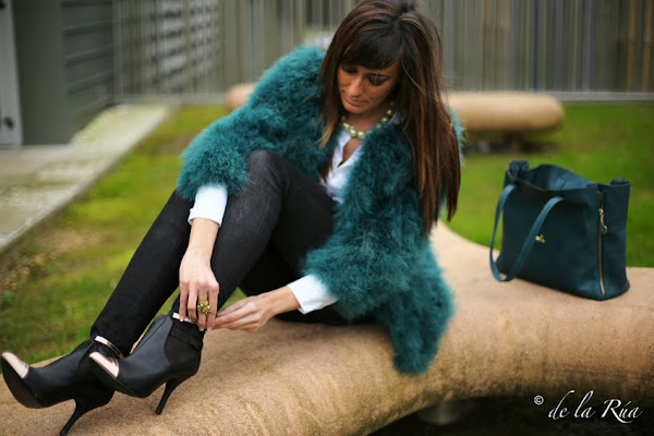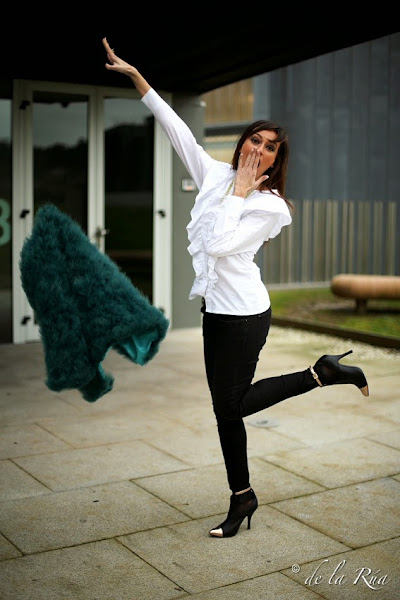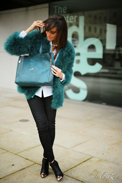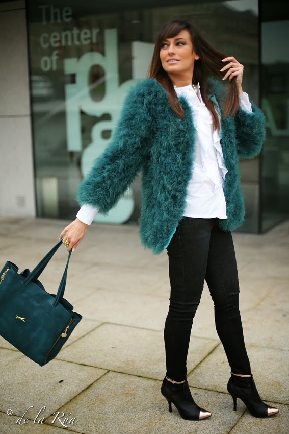 Como os decía, el look de hoy es un look compuesto por un vaquero pitillo negro, una camisa básica blanca, muy atemporal, pero con un toque especial, el de los volantes, y unos tacones negros con puntera dorada, a contraste. Pero, sin lugar a dudas, al margen del collar de bolas y el maxi anillo, que, por cierto, me encantan, la pieza fundamental del look es el vistoso a la par que voluminoso chaquetón verde azulado turquesa; un capricho para abrigarse con estilo que me enamoró nada más verlo en el escaparate de una de mis tiendas favoritas, a juego con el color de mi bolso (un color nada fácil de combinar, por cierto), que ya tiene un par de temporadas.