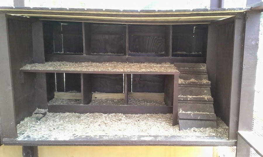 Se pueden apreciar los nidos con sus dos alturas y una rampa de acceso para la altura superior, además tienen acceso por la parte trasera para recolectar los huevos sin molestar demasiado a las gallinas y sin acceder al interior del gallinero.