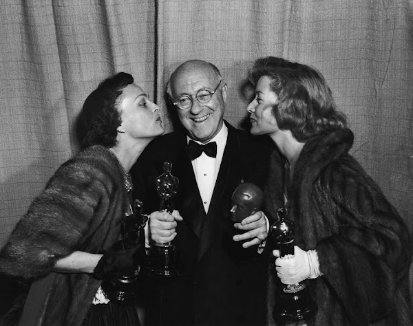 Katherine DeMille Quinn, Cecil B. DeMille y Gloria Grahame con las estatuillas ganadas esa noche.