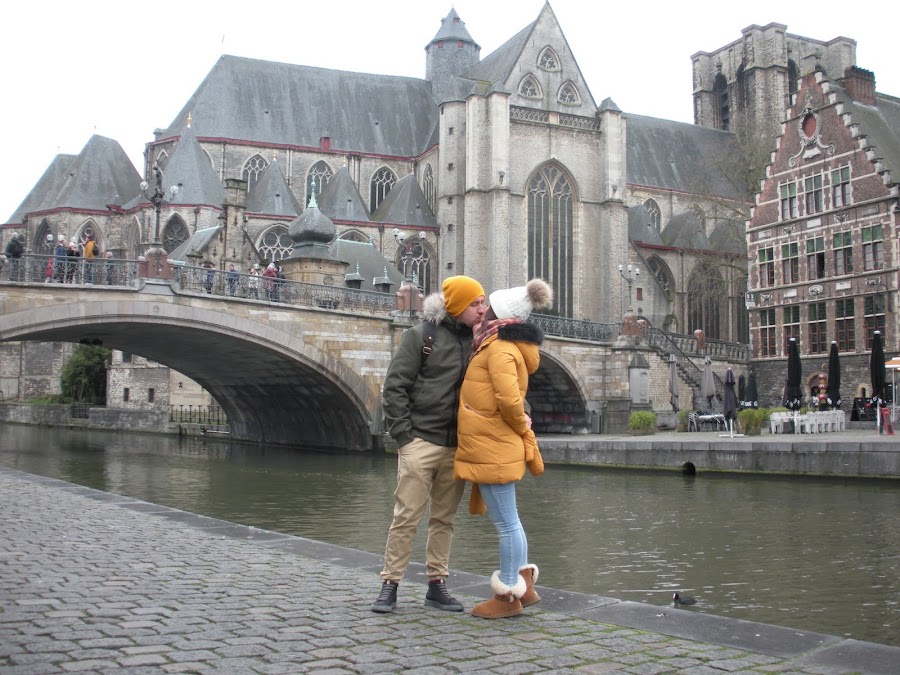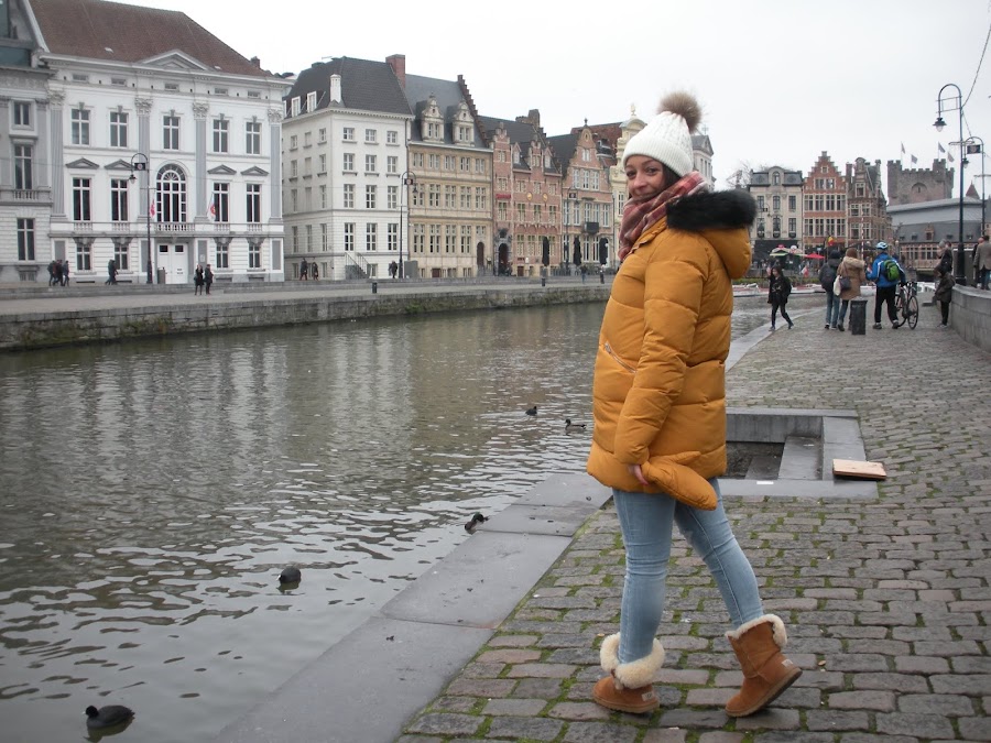 Nuestra primera parada fue el Muelle Korenlei desde donde hicimos estas fotos tan chulas y desde donde salen los barcos que hacen la ruta por los canales. Si no recuerdo mal el paseo costaba 8€ por persona e imprescindible no es, pero como nosotros nos habíamos quedado con el gusanillo de haberlo hecho en Brujas... No lo dudamos y fue lo primero que hicimos.