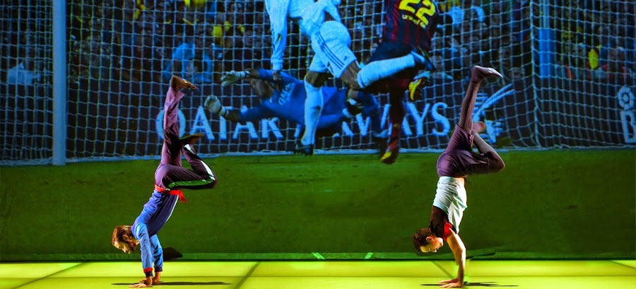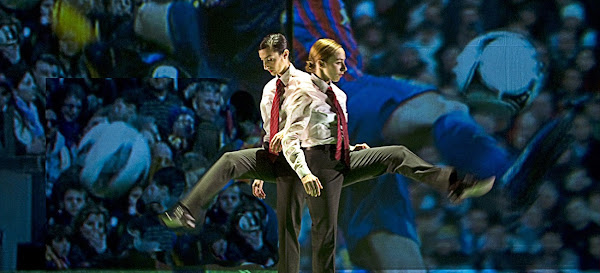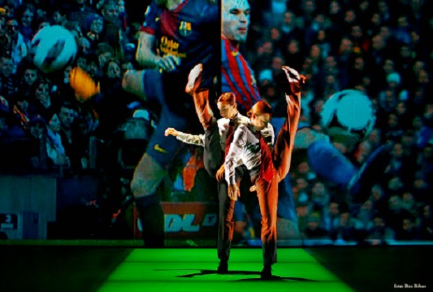 Las bailarines de ?Foot ? ball? con Iniesta de fondo. Foto: Ros Ribas