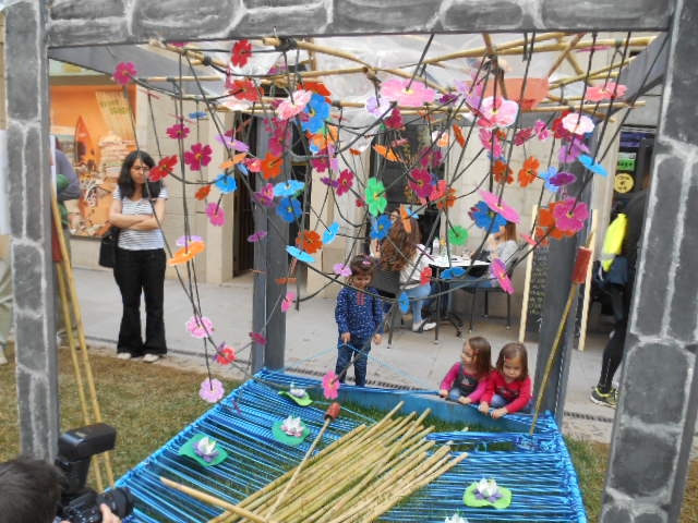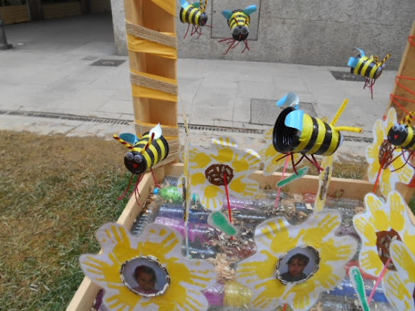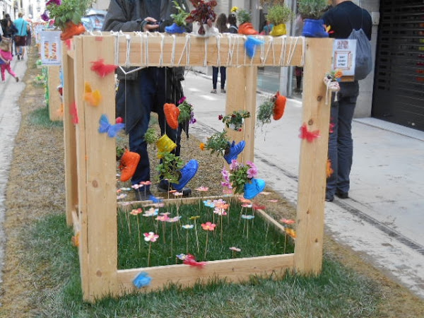 representación de la primavera, toda la calle llena de color e imaginación, avispas, floretas, botas-maceta con sus plantitas