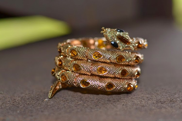 a excepción de los complementos, claro está, también en dorado, como este brazalete tan especial en forma de serpiente enroscada con incrustaciones.