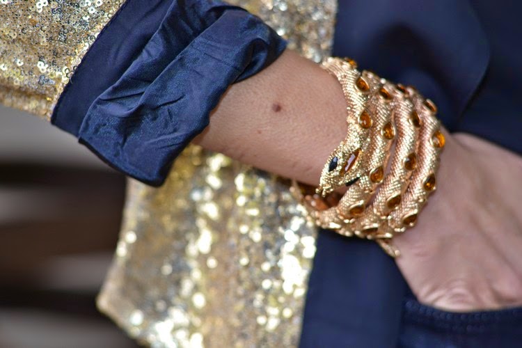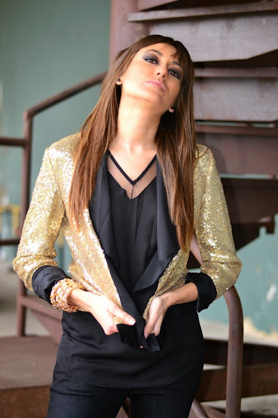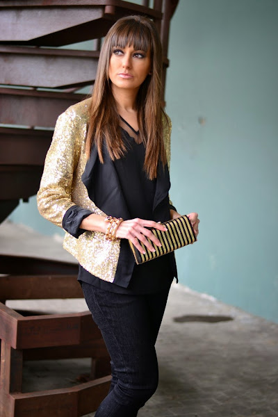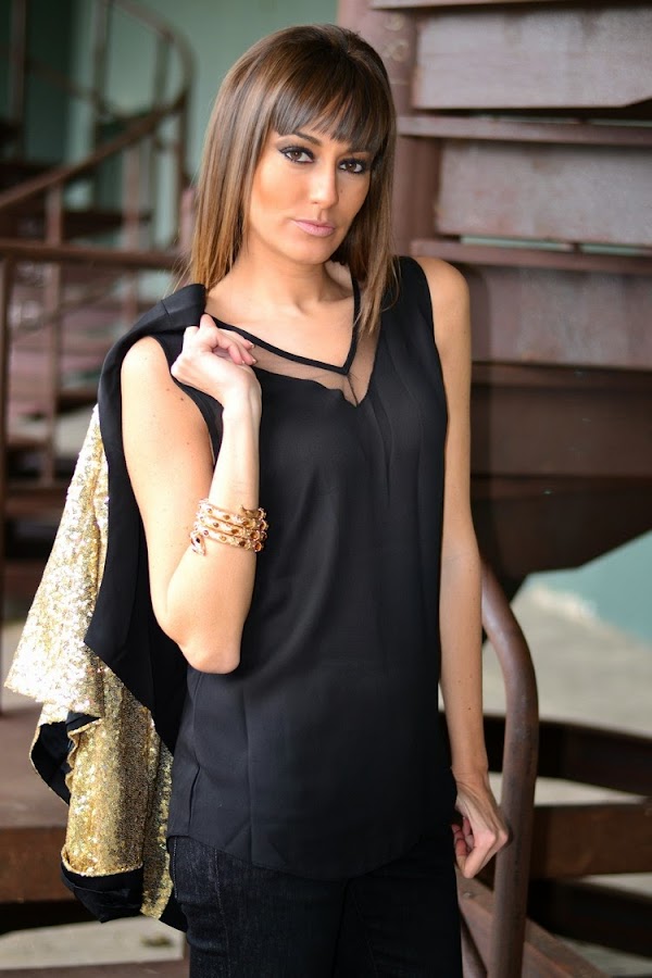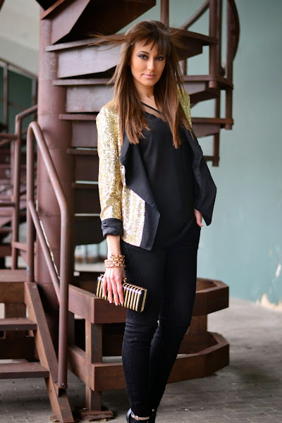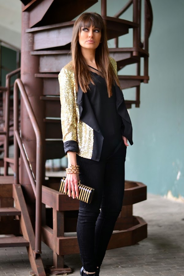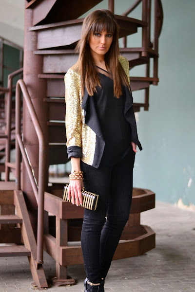 Hacía ya tiempo que no os mostraba alguna propuesta más festiva, así es que hoy lunes, me gustaría iniciar la semana enseñándoos este look nocturno de fin de semana en dorado y negro con chaqueta de paillettes con solapas como protagonista indiscutible.