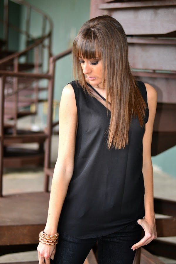 Como ya de por sí sola es tan vistosa, el resto del look va en negro, para no recargarlo demasiado, con top con escote y espalda en forma de pico y pitillos,