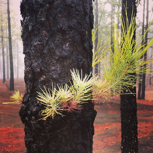 A lo largo de los casi 11 kilómetros y cuatro horas y media de esta magnífica ruta en descenso, tendríamos un primer contacto con los famosos microclimas grancanarios, pasando de una mañana fresca y húmeda a un sol radiante y una temperatura de lo más agradable. Por el camino pudimos comprobar lo afortunados que somos los canarios al tener unos pinos endémicos que se recuperan con una facilidad increíble de los incendios y sequías.