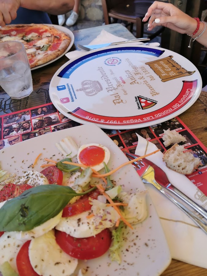Comidita en Dal presidente Pizzeria atendidas por un amable (cosa rara en la isla) camarero, una rica pizza margarita y ensalada caprese