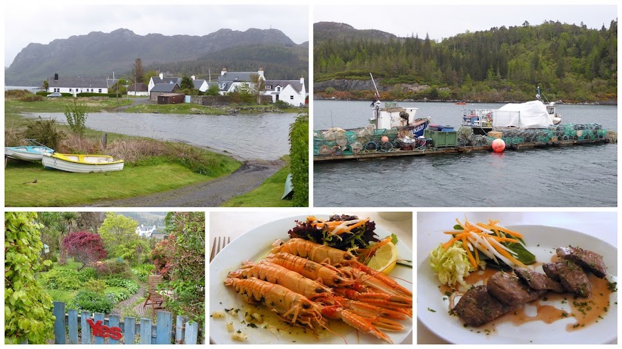 Para terminar esta etapa, nos falta llegar a Plockton, una bella ciudad llena de jardines, flores y bellas casitas, situada junto a la costa y uno de los mejores lugares para disfrutar del marisco de Escocia. Tras dar un paseo, me decidí por comer en un pub, y pude probar dos platos gloriosos. Por un lado las cigalas y por otro unos trozos de carne de venado deliciosos.