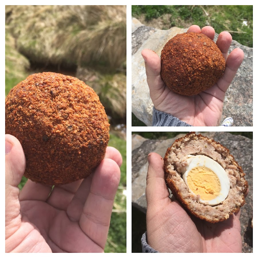 Como el viaje desde Balmoral es largo, y aún tenía que llegar a Eilean Donan, me convenía reponer fuerzas y para ello, nada mejor que probar un Scottish Egg, un huevo cocido envuelto en una gigantesca albóndiga de carne especiada que después se reboza y se fríe.