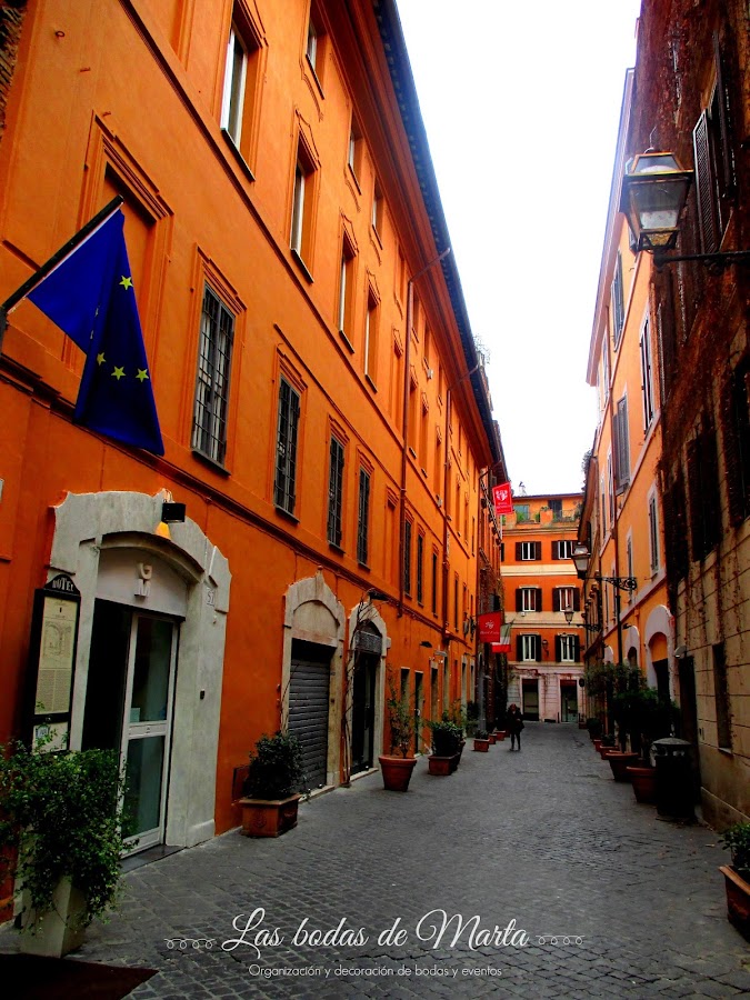 El hotel está situado en una de las calles más bonitas de Roma, VIA MARGUTTA. De hecho sale hasta en la guía que compré. Al parecer en Mayo se llena de puestecitos con pintores. Si así lloviendo y en invierno era bonita, no me la imagino en primavera/verano todo lleno de flores.