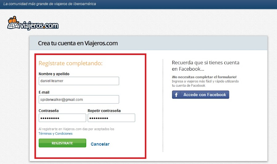 El formulario de registroen Viajeros resulta mucho más práctico y sencillo de lo que resulta ser en otras comunidades en Internet ya que solo necesitamos ingresar nuestros nombres, correo electrónico y finalmente asignar una contraseña la cual debe ser fuerte y a su vez una que podamos recordar para no tener problemas la siguiente ocasión que queramos iniciar sesiónen este foro. Veremos al lado de dicho formulario el enlace para asociar nuestra cuenta de Facebook para tener una cuenta en este foro la cual es una opción válida al igual que el formulario.