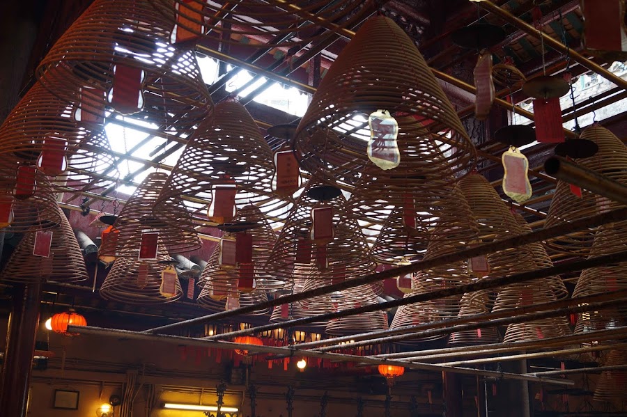 Buscando vestigios de la antigua China visitamos el templo Man Mo, un remanso de paz en medio de la vorágine de la ciudad. Es muy curioso, con sus espirales de incienso colgando del techo.