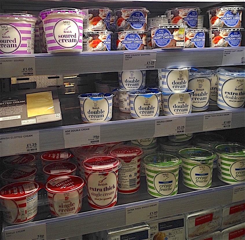 Como dice Bea Roque, el paraíso de los lácteos. Tantas variedades diferentes ¡qué envidia! Si hay algo que me encantó de visitar los supermarkets de Londres es ver la variedad de productos lácteos frescos. A partir de la leche hacen más cantidad de derivados: soured cream, clotted cream, double cream, extra thick double cream, single cream, extra thick single cream, crème fraîche, … Y eso que este es un Simply food Mark & Spencer para salir del paso. No me quiero imaginar la cantidad de derivados lácteos que habrán en otros supermarkets más grandes!!!!!