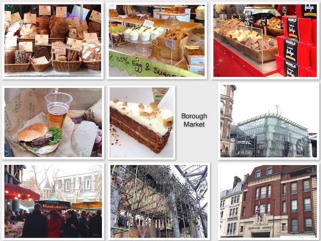 Si queréis comer bien, productos preparados, de calidad, y algunos de producción propia y casera no podéis iros sin visitar Borough Market. Me encantó!!! Eso sí, el sábado estaba hasta la bandera!!!! Mi marido dice que la hamburguesa que nos comimos allí es la que mejor que ha probado en su vida. Hay un bar que pone un puesto en la puerta y las vende como si no hubiera mañana. Se llama Whiskey Ginger-Borough, vale la pena hacer la cola. Una hamburguesa y una pinta ¡qué felicidad! Y eso que no me gusta mucho la cerveza pero yo es que en el extranjero me mimetizo. Donde fueres haz lo que vieres. Aviso 1 pint es casi 1/2 l de cerveza!!!! Así que si no queréis tanta pedid half pint. La comida de estos puestos me pareció de lo más auténtica y había para todos los gustos. Y como colofón pedimos una Carrot Cake. Veréis luego que me recorrí varias pastelerías, pues este trozo de tarta le daba mil patadas a todas. Parecía sacada de un horno casero. El puesto es Ion Patisserie, de veras, la mejor que he probado en mi vida. Y si me conocéis un poco sabéis que por un trozo MA-TO. Jugosa, húmeda, espaciada, sabrosa, OMG tengo que volver a hacerla de nuevo. No os perdáis este mercado, es un verdadero placer. Las hamburguesas, empanadas inglesas, quesos, mermeladas caseras, y los dulces!!!! Tartas caseras, cookies, funges, cupcakes, chocolates, … Y los panes de mil formas, semillas harinas, Sordough, … Además de los puestos “callejeros” tienen fijos tipo Mercado Central con productos frescos. Indispensable.