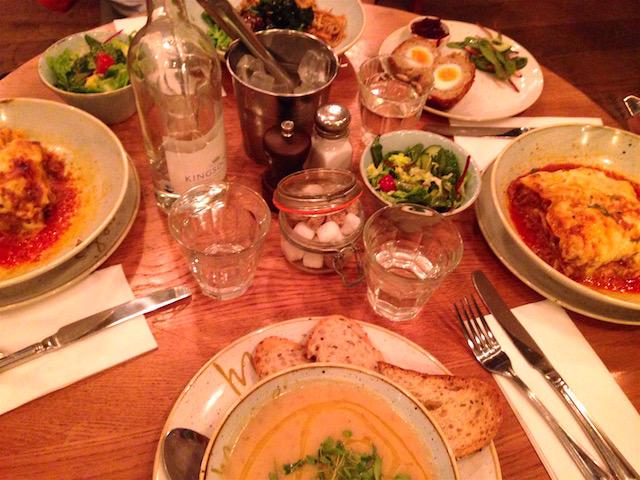 Fuimos a comer y tomamos Scottish egg, lasaña, noodles y sopa de la casa que aunque estaba buena no era sopa sino una crema de verduras. Pero después de tanto sandwich frío me apetecía algo caliente. Por cierto, puedes pedir agua embotellada o agua del grifo. Un a la pagas, la otra no.