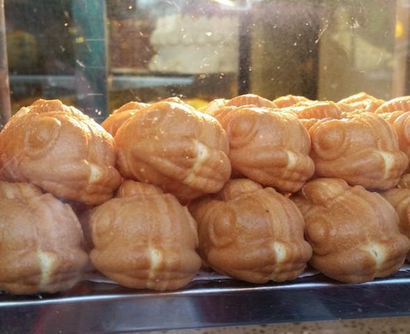 O ver cómo en Chinatown Bakery hacen una masa esponjosa en unos moldes muy graciosos con formas de pez. Son los Tay Yaki y van rellenos de crema. También había pasteles, tartas, bollería y Cheesecake japonés.
