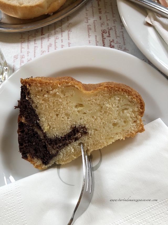 Pedimos un desayuno completo checo, con chocolate caliente y un trozo de bizcocho.