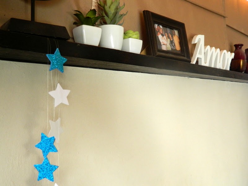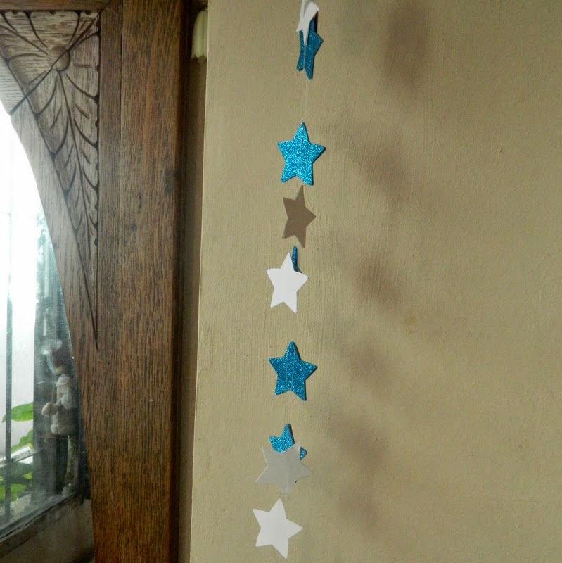 ¿Piensan que exagero? Pues no: entré al escritorio con una escoba y a los cinco minutos tenía en las manos una troqueladora, un resto de papel con brillantina color turquesa, opalina blanca, tanza y qué hago....Una guirnalda. Conclusión: cuando llegó la hora de ir a buscar a Camilo al jardín, el escritorio seguía desordenado, pero tenía tres guirnaldas terminadas.