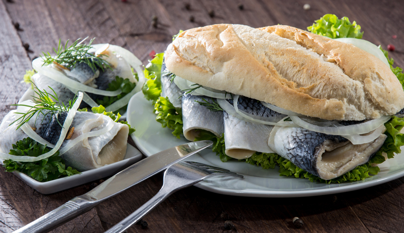 Bismarckhering: arenque aliñado en vinagre con mostaza, cebollas y laurel.