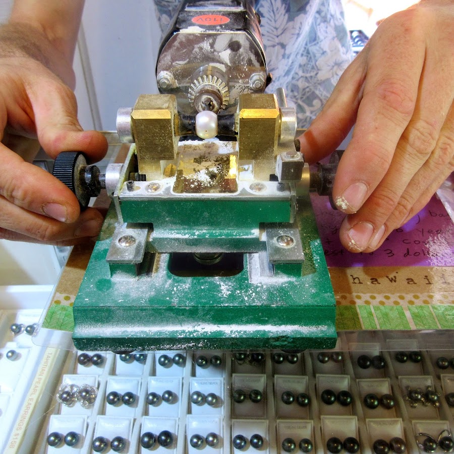 La perla que elegí siendo perforada para convertirse en el popular collar surfista.