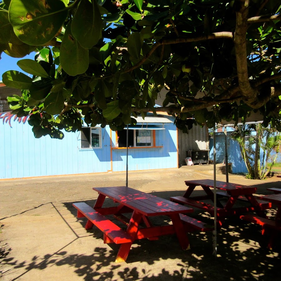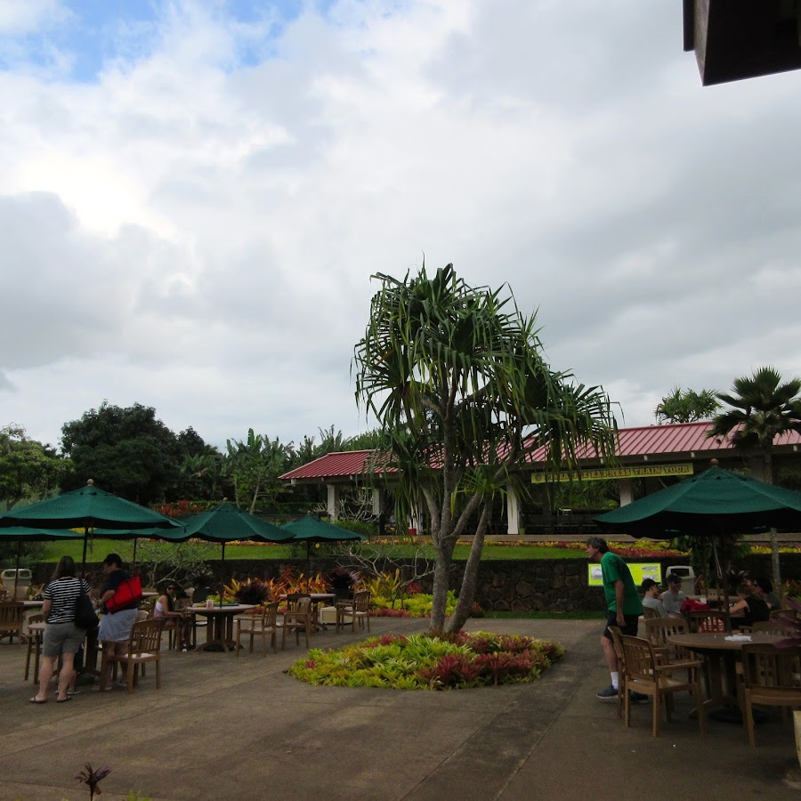 Las mesas con sombrillas de DOLE dónde los turistas disfrutan del sabroso helado de piña u otros platos típicos como el loco moco.