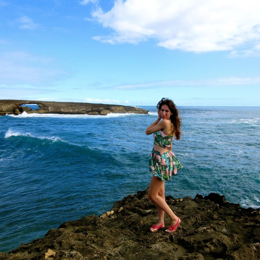 Mi OUTFIT: conjunto de falda y crop top de Target, sandalias fucsias compradas en mi viaje a Costa Rica, pulseras de PULL & BEAR, pulsera del pie Ardene, collar de perla local adquirida en el tour, flor hawaiiana local, pendientes FOREVER XXI.