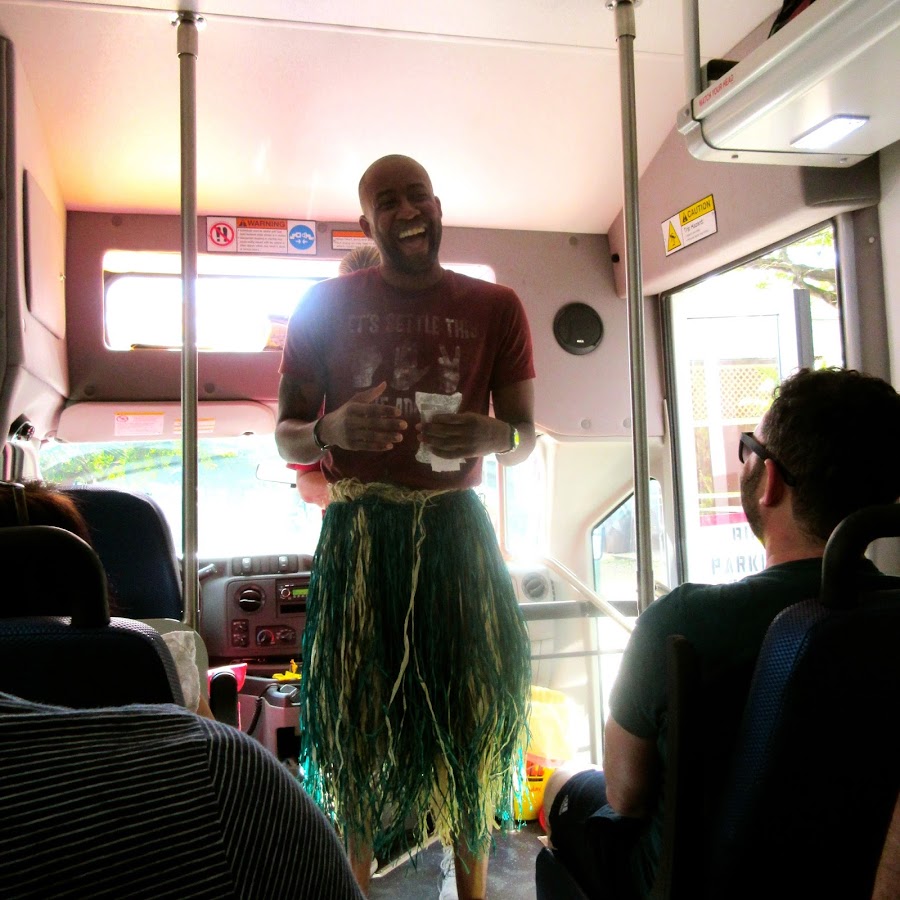 El lema del tour era: quien llegue último al bus le colocan la falda hawaiiana, las flores y ... BAILA DELANTE DE TODOS!, ya imaginarán que las personas trataban de ser puntuales en las paradas de tiempo libre que nos regalaba nuestra guía turística.