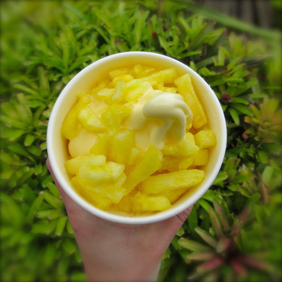 Luego descubrí que es normal que regalen esta fruta al visitar las enormes plantaciones de piña que posee la isla de Oahu. Entre ellas Dole, una atracción muy turística con piñas de todas las clases, una tienda de souvenir gigantesca donde podrás perderte entre todas las bonitas manualidades típicas de la Isla, degustar platos locales o probar muestras de sirope de piña o frutos secos, hacerte un tatuaje de henna o como en mi caso comer un enorme helado de piña con trozos de piña, sinceramente el mejor que haya probado en mi vida!.