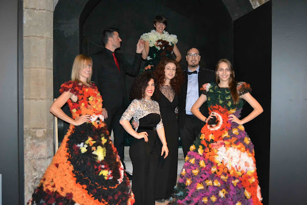 La diseñadora de Estilo Mimosa, posa junto a Younes Ben, su equipo y las modelos que llevan sus diseños. Son exclusivos vestidos que dan forma y movimiento a su colección privada de cuadros