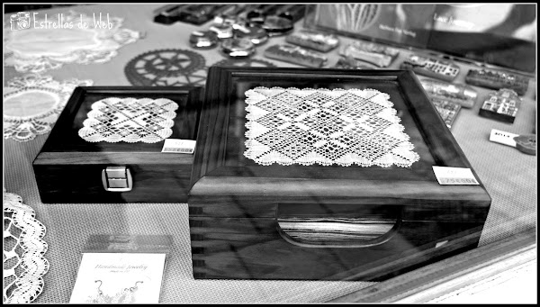Detalle de decoración en caja realizado con puntilla de encaje de bolillos.