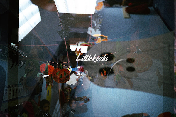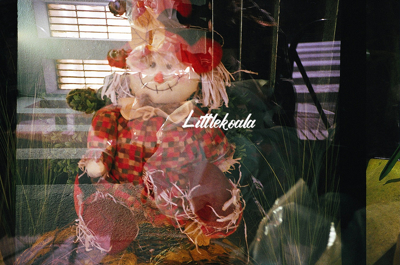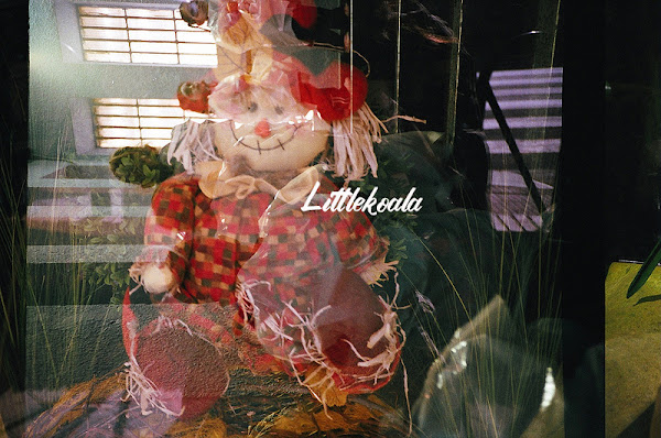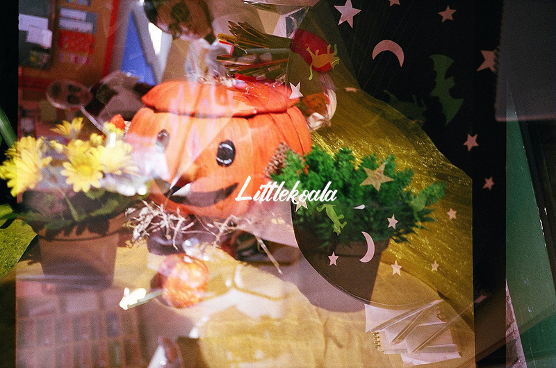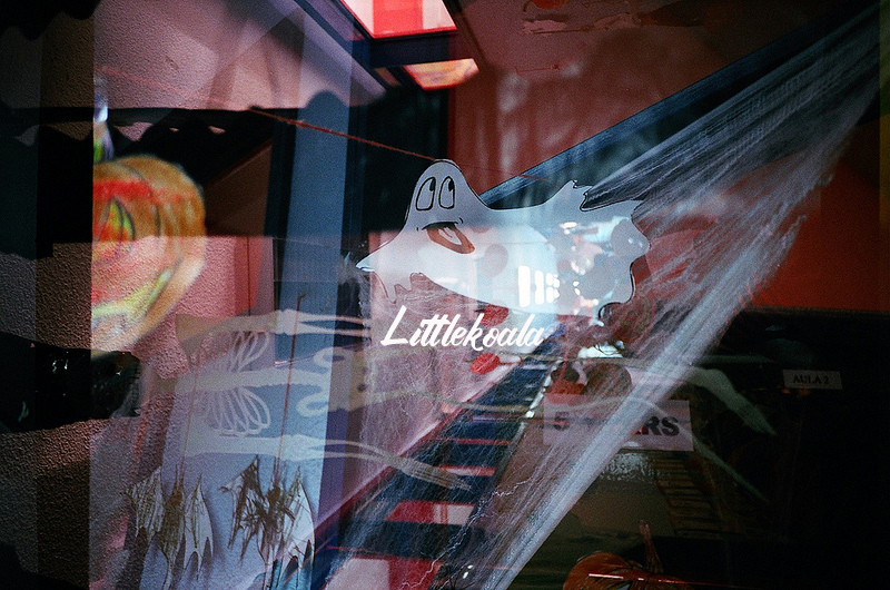 Como ya os he contado alguna vez, "hacer dobles" consiste en realizr dos exposiciones en el mismo fotograma. Se pueden hacer disparando dos veces "sin pasar" el carrete, o haciendo un carrete entero, rebobinarlo y volver a hacer fotos encima de las que ya habíamos hecho. En ese caso, lo hice de la segunda manera, primero en el colegio a la decoración de Halloween y después fotografiando los adornos de una tienda que había cerca de casa, obteniendo esteresultado tan chulo.