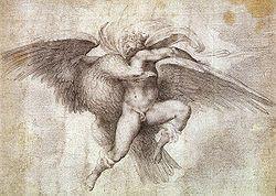 ...porque aprendiese a dibujar le hizo muchas láminas, trazadas con lápiz negro y rojo, de cabezas divinas; y después un dibujo de un Ganimedes arrebatado al cielo por el ave de Júpiter, un Ticio al que el águila devora el hígado, la Caída del carro del Sol con Faetón y una Bacanal de niños, todas unas obras singularísimas, unos dibujos nunca visto de tan excelentes.]