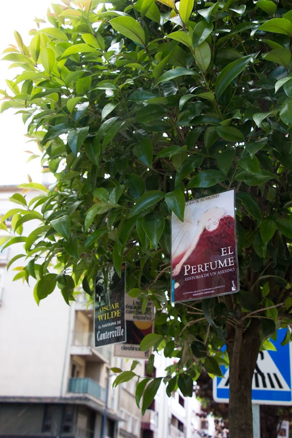 Sabiñánigo es curioso porque está dividido en dos partes. Nosotros estábamos lejos del casco antiguo y del ayuntamiento, en la zona habilitada para los corredores. Pero durante la mañana decidimos conocer todo el pueblo y caminar el kilómetro escaso que los separa. Aunque no es el pueblo más bonito del mundo, la verdad es que fue un paseo agradable. Encontramos una floristería en la que compramos menta chocolate y una librería infantil que me enamoró totalmente. Evidentemente compramos un libro, una especie de pintar por números pixelado, con montones de figuras geométricas diminutas, que nos encantó. Los árboles cercanos a la librería estaban decorados con portadas de libros y eso también me fascinó.
