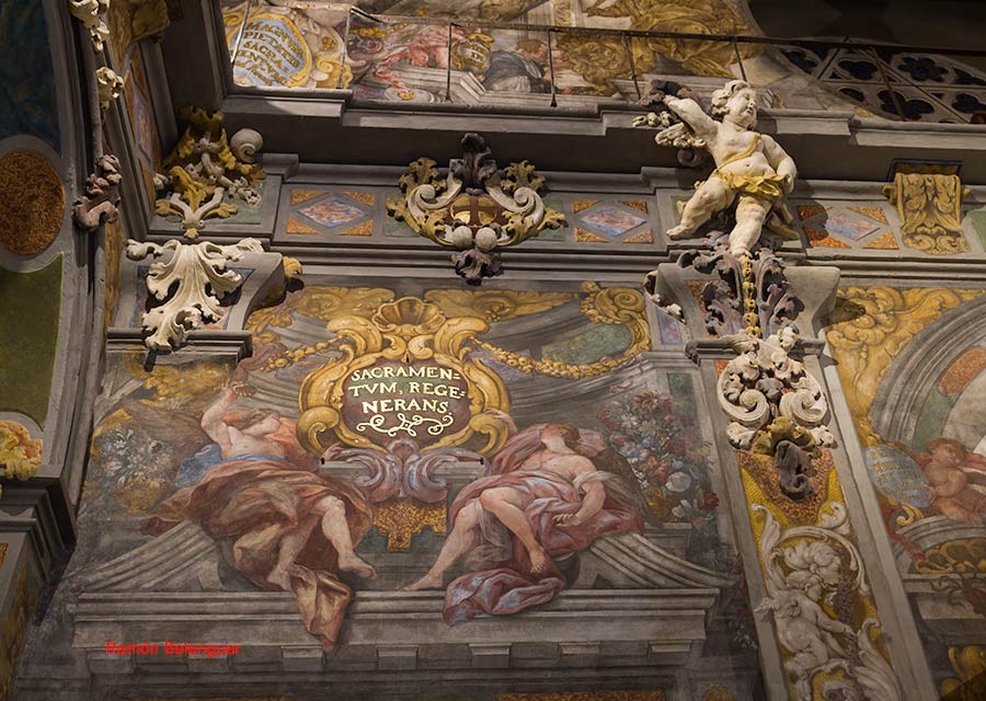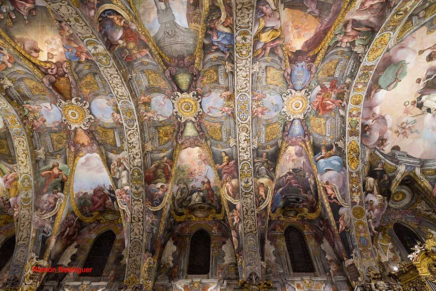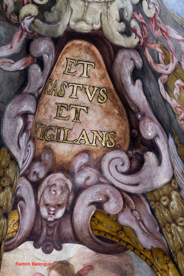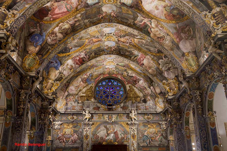 Los frescos de la bóveda al igual que el resto de la pintura al fresco del templo es obra de Antonio Palomino y Dionís Vidal (ca.1670-ca.1719) realizadas hacia 1700. Vemos la Glorificación de San Pedro Mártir y San Nicolás de Bari en el centro de la bóveda. Alrededor del óvalo que forma la glorificación, distintos doctores de la iglesia: Santo Tomás de Aquino, San Agustín obispo de Hipona, San Gregorio Magno papa, San Ambrosio obispo de Milán, San Jerónimo y San Buenaventura. Una inscripción dividida por silabas a los pies de cada uno de los doctores dice en su conjunto: "Vos estis sal terrae. Vos estis lux mundi (Vosotros sois la sal de la tierra. Vosotros sois la luz del mundo).