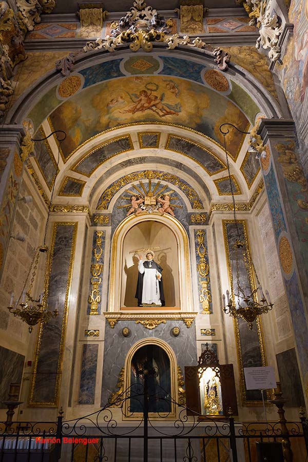 Capilla de San Dionisio, Capilla de San José de estilo neoclásico del siglo XVIII, Capilla de San Rafael Arcángel y del Beato Gaspar Bono barroca del siglo XVIII sobre otra anterior gótica del siglo XV. Capilla del Sagrado Corazón de Jesús. Capilla de San Antonio de Padua, Capilla del Bautismo, Capilla de San Vicente Ferrer En la hornacina central talla de vestir del santo dominico, obra del escultor Carmelo Vicent. En esta capilla fue enterrado el médico valenciano Jaume Roig junto con su esposa Isabel Pellicer. Capilla de la Inmaculada Capilla de estilo neoclásico siglo XVIII. Capilla de San Judas Tadeo Capilla de estilo neoclásico del siglo XVIII. Capilla de la Virgen de la Paz Capilla de estilo neoclásico siglo XVIII. Capilla de la Crucifixión o del Calvario Retablo formado por una imagen de bulto redondo de Cristo Crucificado (siglo XVI) sobre un fondo pictórico realizado por Joan de Joanes. Es el conocido como retablo de la Crucifixión. En el retablo solo está representada la cruz de madera por lo que la talla de Cristo viene a complementar el conjunto. Capilla MayorPreside el Altar Mayor un retablo barroco realizado en el siglo XVIII en madera dorada con una decoración desbordante. El dorado del retablo es de 1867. Las esculturas titulares son obras realizadas hacia 1940 por Francisco Teruel y Enrique Tamarit. En el presbiterio encontramos además del Retablo Mayor, dos retablos laterales formados por diversas tablas. Ambos realizados a expensas del gremio de pelaires ya que lucen y repiten sus emblemas en los frontales de los mismos.