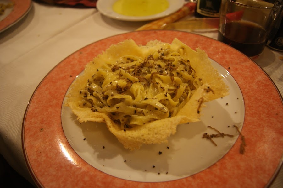 Para mí su plato estrella era la pasta que recomienda la casa, es la que me pedí; unos tallarines con nata y trufa negra servido en cuenco de queso grana-padano, ufff!! Impagable; riquísimo. Os pongo la foto que le hice instantes antes de devorar los tallarines mientras comía trocitos del cuenco hasta que termine con ambos ( es una forma muy original de servirlos y que algún día incorporaré en mi recetario ,jeje)