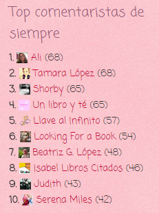El mes pasado ganaron: Un libro y té, Llave al Infinito, Beatriz López y por sorteo entre todas las de la lista le tocó a Ali. Como ellas ya han recibido este premio, vamos a dejar que lo puedan obtener otras personas y por eso voy a elegir a una afortunada de entre todas las de las dos listas para que se lleve a casa un cuarto premio.