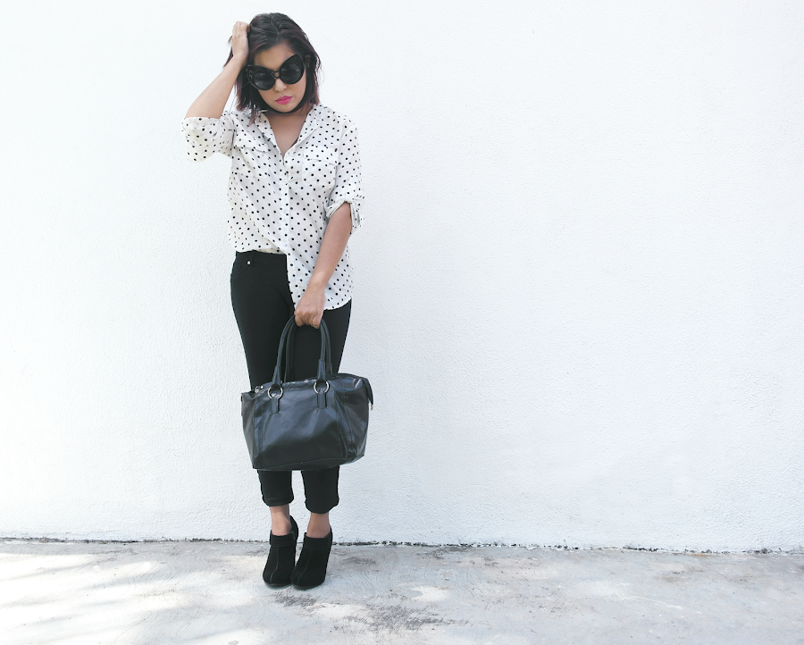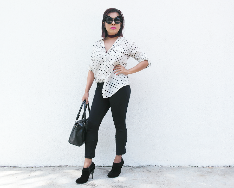 Para el look de hoy, estoy utilizando una blusa con estampado polka dots, lleve las mangas a ¾ para darle un toque descuidado y metí solo un lado dentro de los pantalones para que mi cintura se viera un poco, pero sin márcala demasiado. Un pantalón negro, al cual le hice un maxi dobladillo para lograr también un estilo cropped, lentes de sol (el accesorio catlove fijo) y chokers, que son mis accesorios favoritos de la temporada.